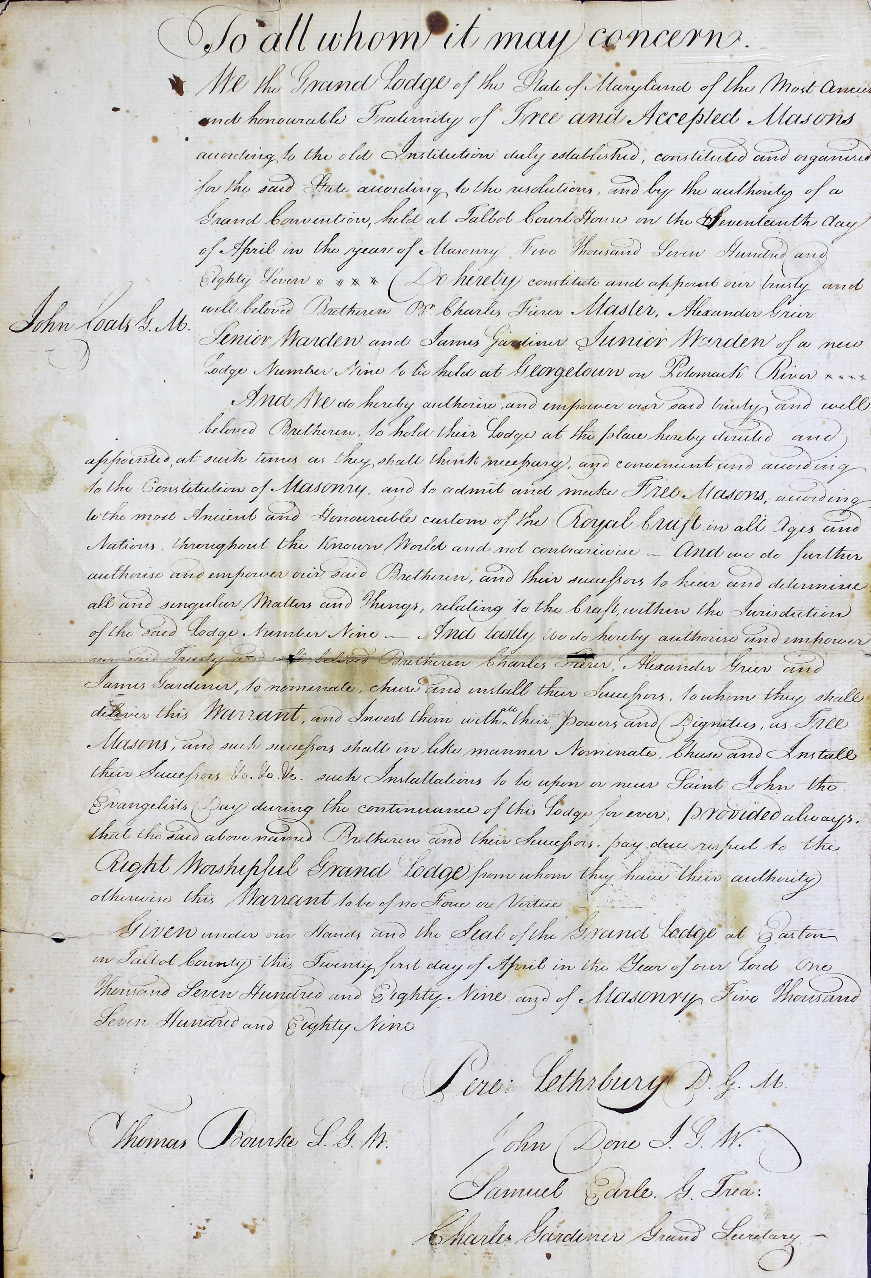 On April 21st 1789, the same day in which John Adams was sworn into office as the first Vice-President, a meeting of Maryland Freemasons was held in the town of Easton, Maryland. A petition to form a new lodge was received and granted to “a number of respectable brethren from George Town on the Patowmack River.” Major Charles Fierer, Georgetown’s first printer, was appointed the head of Lodge No. 9 of Maryland, now known as Potomac Lodge No.5 of D.C.