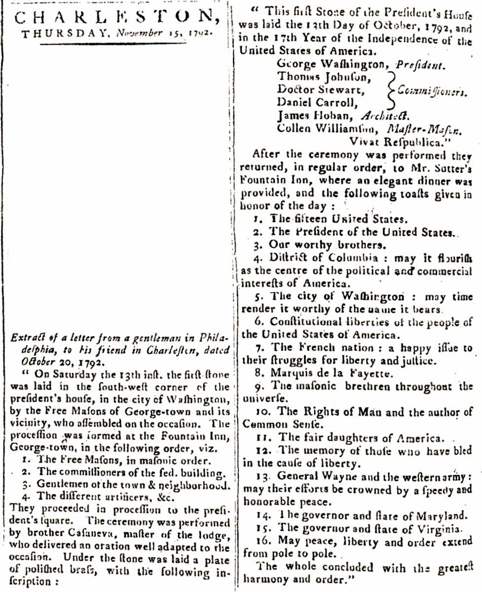 On October 1792, the lodge formed a procession and marched from Georgetown to the present site of The White House. Peter Casanave, the leader of the body and the 4th Mayor of Georgetown, laid the cornerstone of the building in Masonic tradition. Other notable Freemasons including the White House architect, James Hoban, most likely attended the ceremony. The procession then returned to their hall, a tavern, and celebrated the occasion with an elegant banquet. The only known account of this ceremony was published in the City Gazette of Charleston, South Carolina on Nov. 15, 1792.
